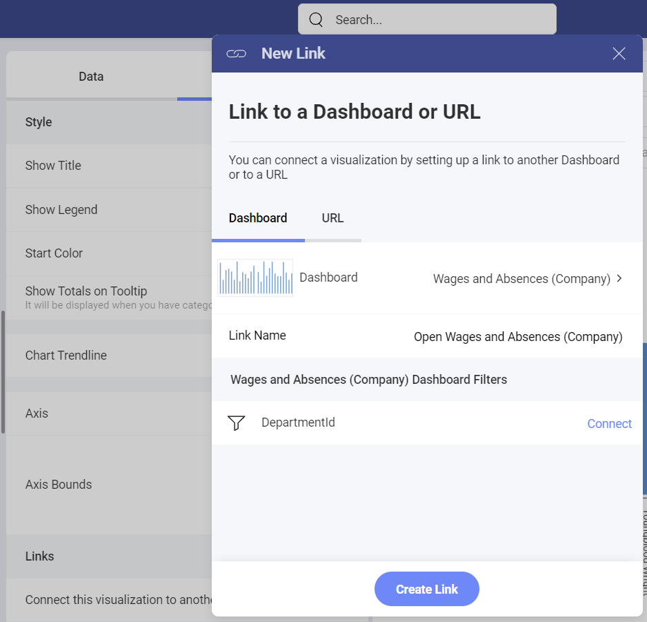 To configure a link, go to the Settings section of the Visualization Editor and click/tap on the + in Links. Alternatively, you can choose Connect this visualization to another dashboard or a URL.