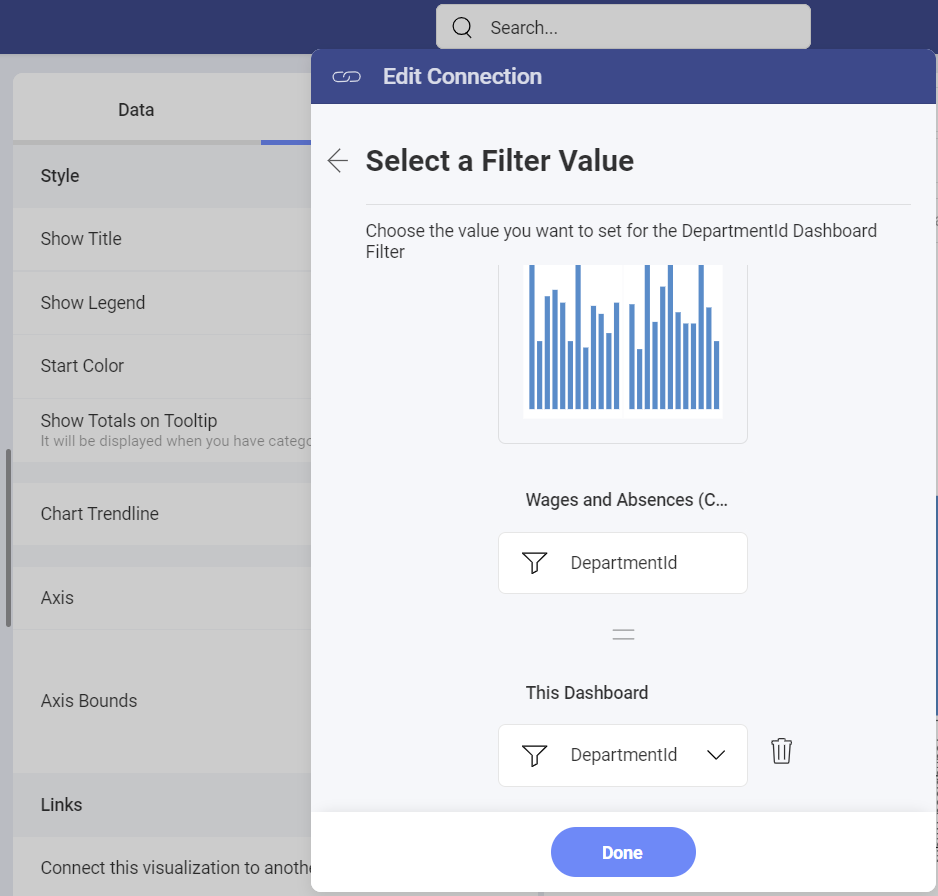 If you have added dashboard filters to the target dashboard, then you will also need to connect the dashboard filters to their corresponding fields in the dataset of the visualization you are adding a link to (see below). Click Done and go back.