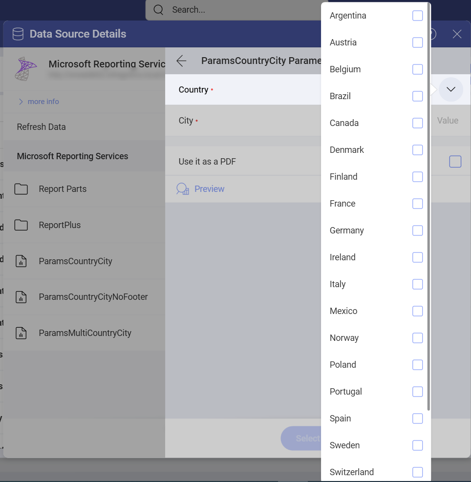After configuring the connection to your Microsoft Reporting Services reports and selecting the data source location, the following dialog will open, prompting you to choose the data you want to work with: