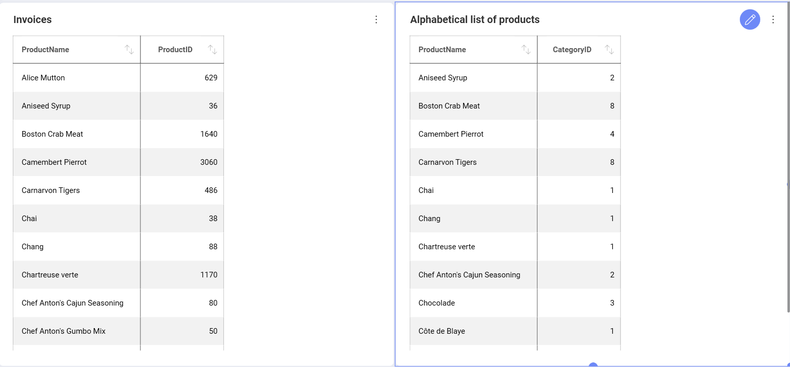 In the example below, the Invoices view contains part of the data in the Alphabetical list of products table in the SQL Server.