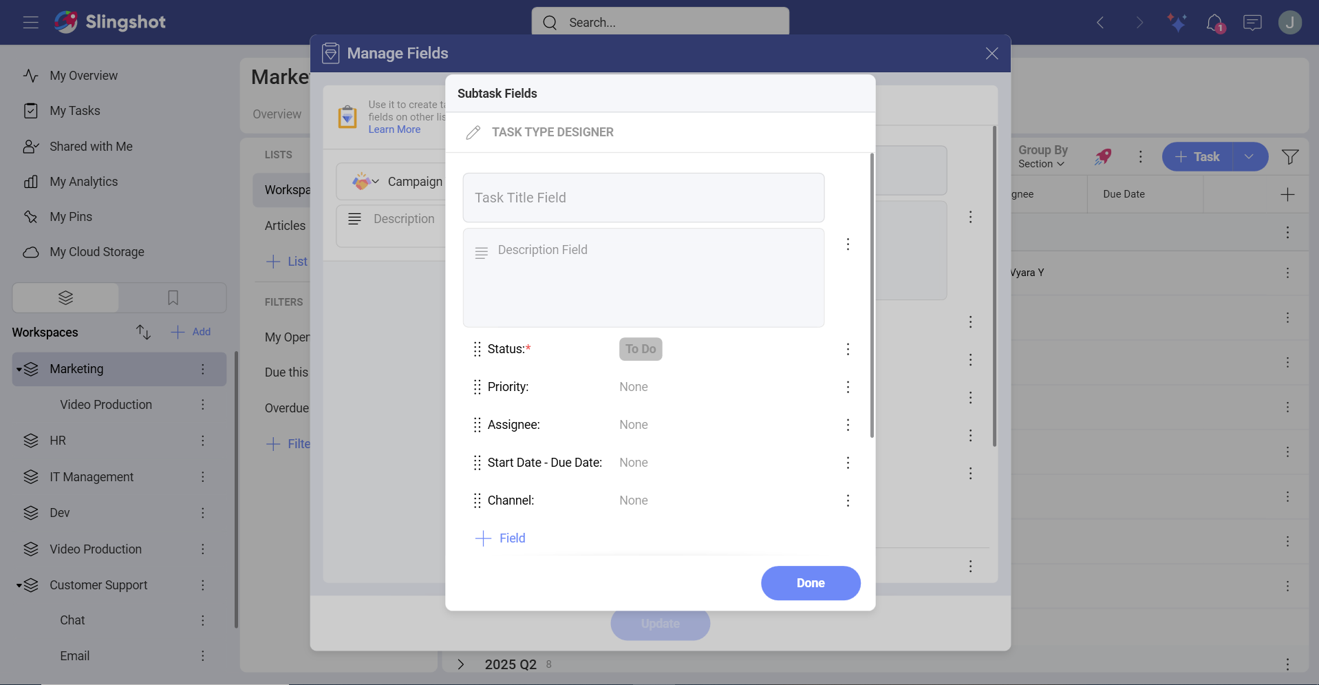 [!Note] If you add or remove fields from subtasks that have a specific task type, these changes will affect the type and its tasks.