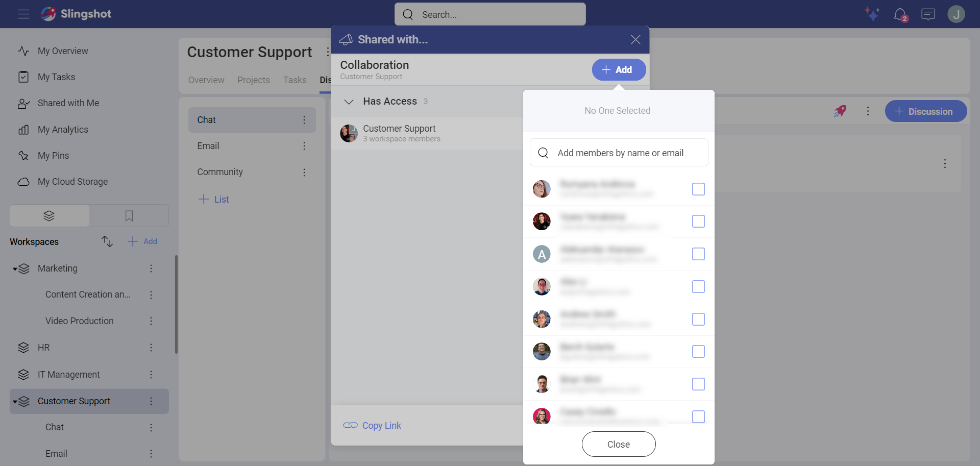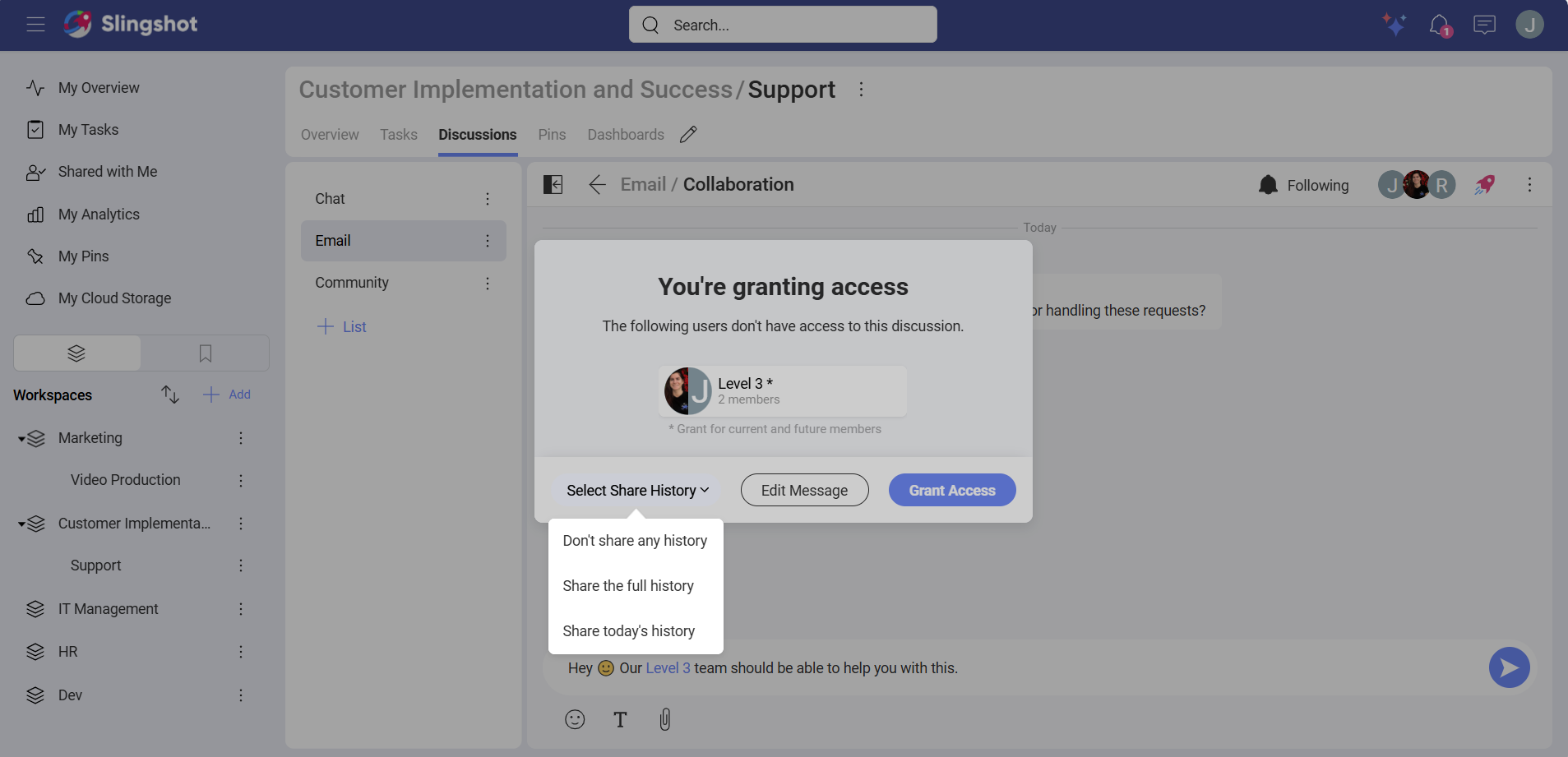 Depending on where you stand, you will find different discussions. To guarantee the privacy of workspaces and projects, Slingshot does not allow you to access all discussions. So read on to find out who can access what!
