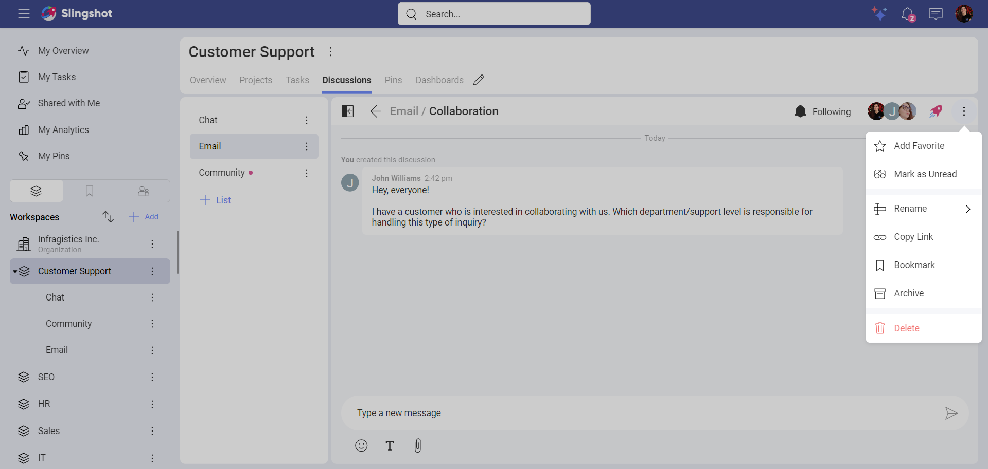 Not all discussions would be interesting to you or need your participation. To prevent your Slingshot discussions become overwhelming, you can unfollow or delete discussions.