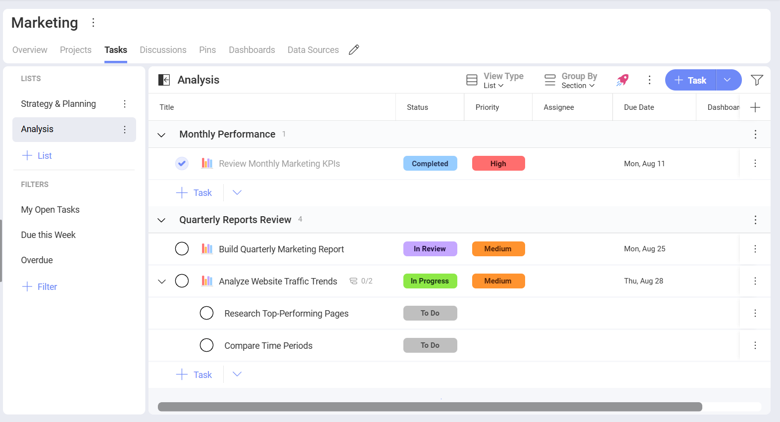 Within each of the task views you can filter the tasks in a way that best suits your teams' goals.